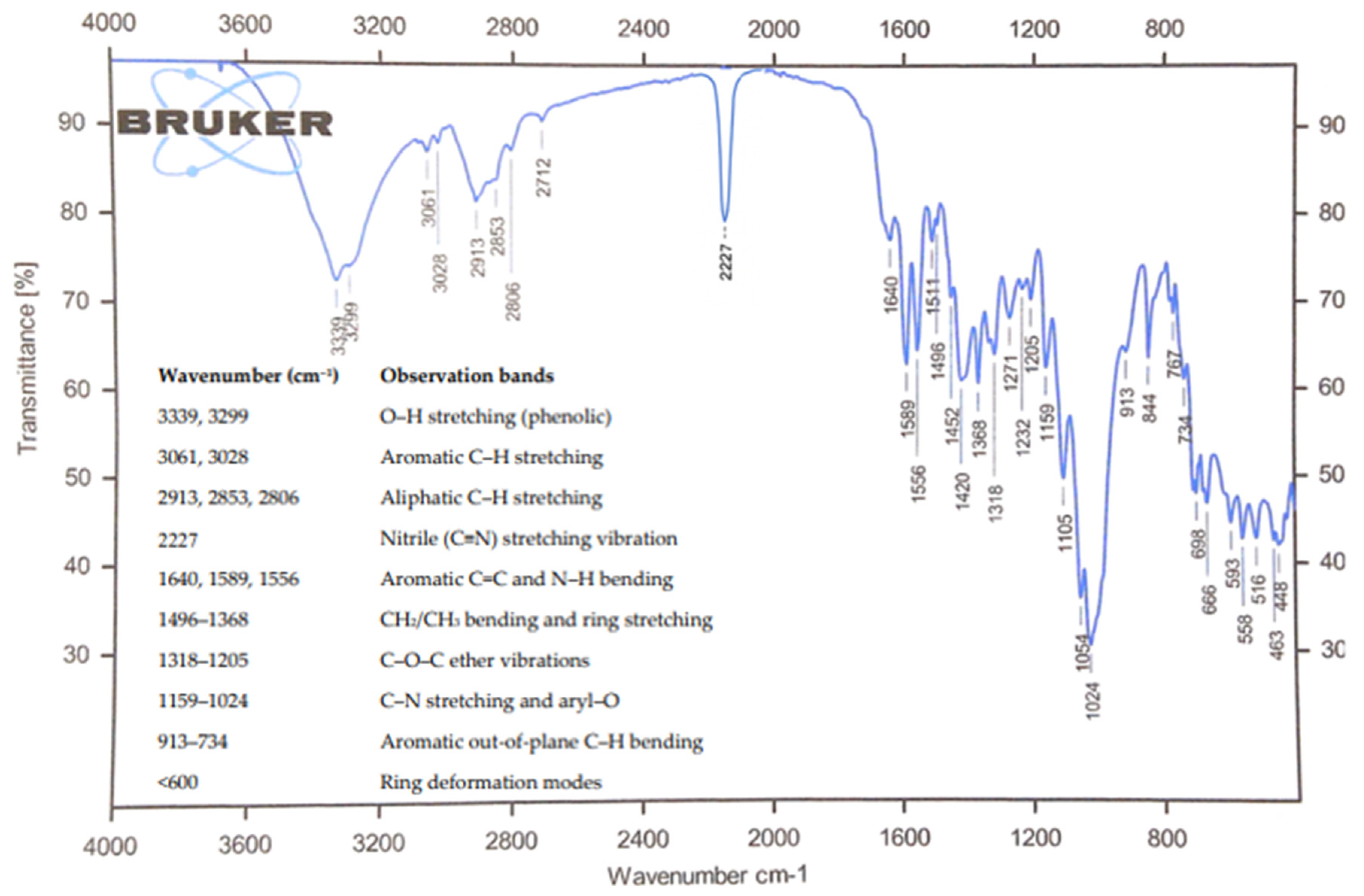 Sample | ν(N–H) | ν(C≡N) | ν(C=O) | ν(C–N) | ν(C–O–C) | ν(C=C) (Aryl) | ν(M–N) | ν(M–O) |