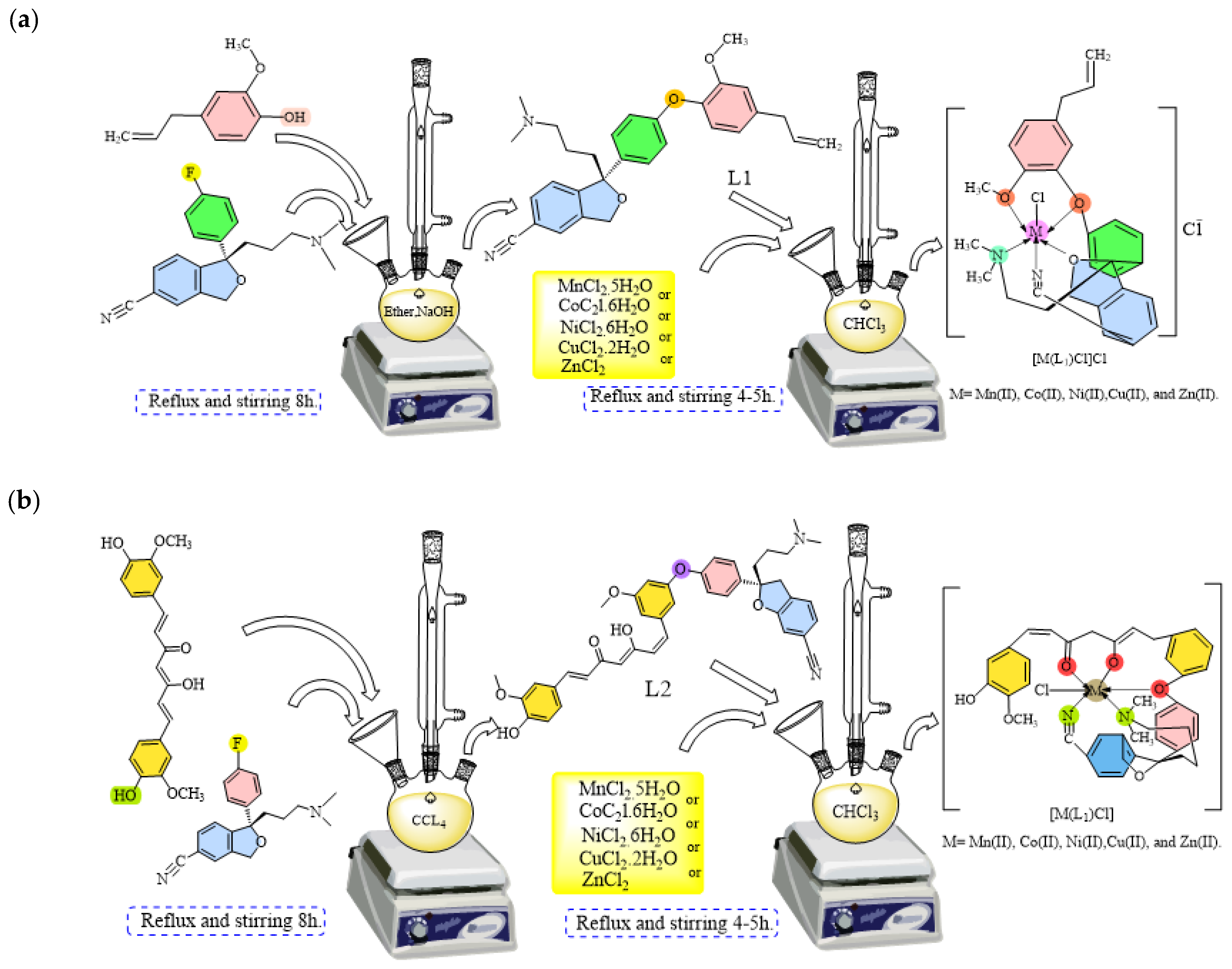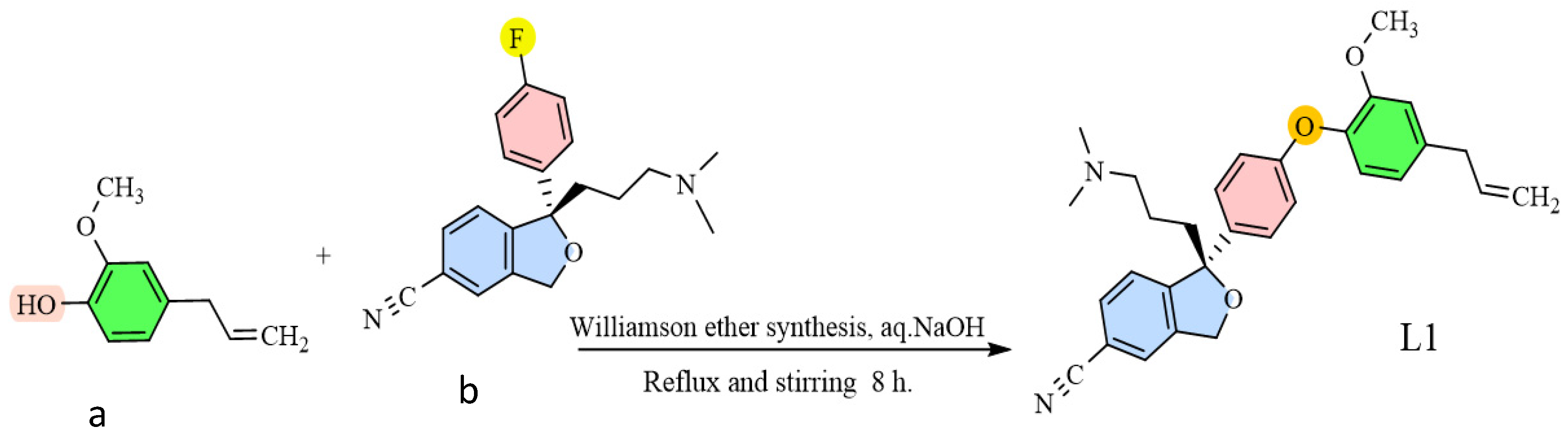 2.2. Preparation of the Mixed Escitalopram and Clove Oil (Eugenol) (Esc-Eug) Ligand
