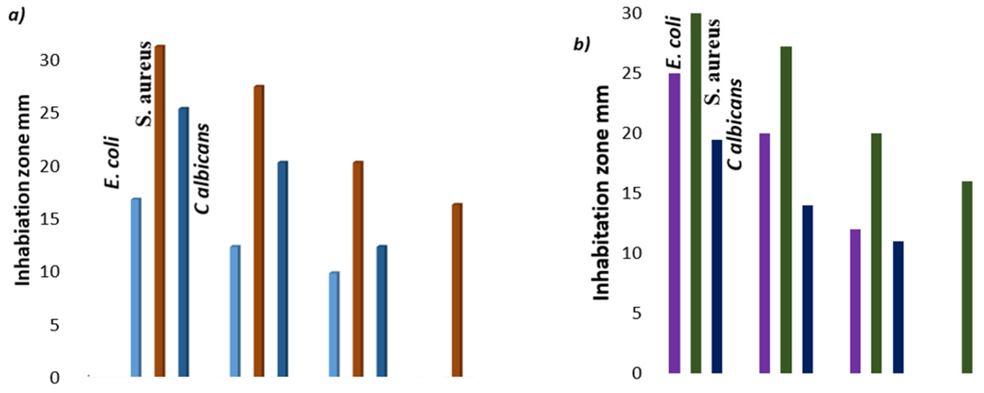 Complexes | Conc. mg/mL | Escherichia coli St = 24 | Staphylococcus aureus St = 25 | Candida albicans St = 21 |