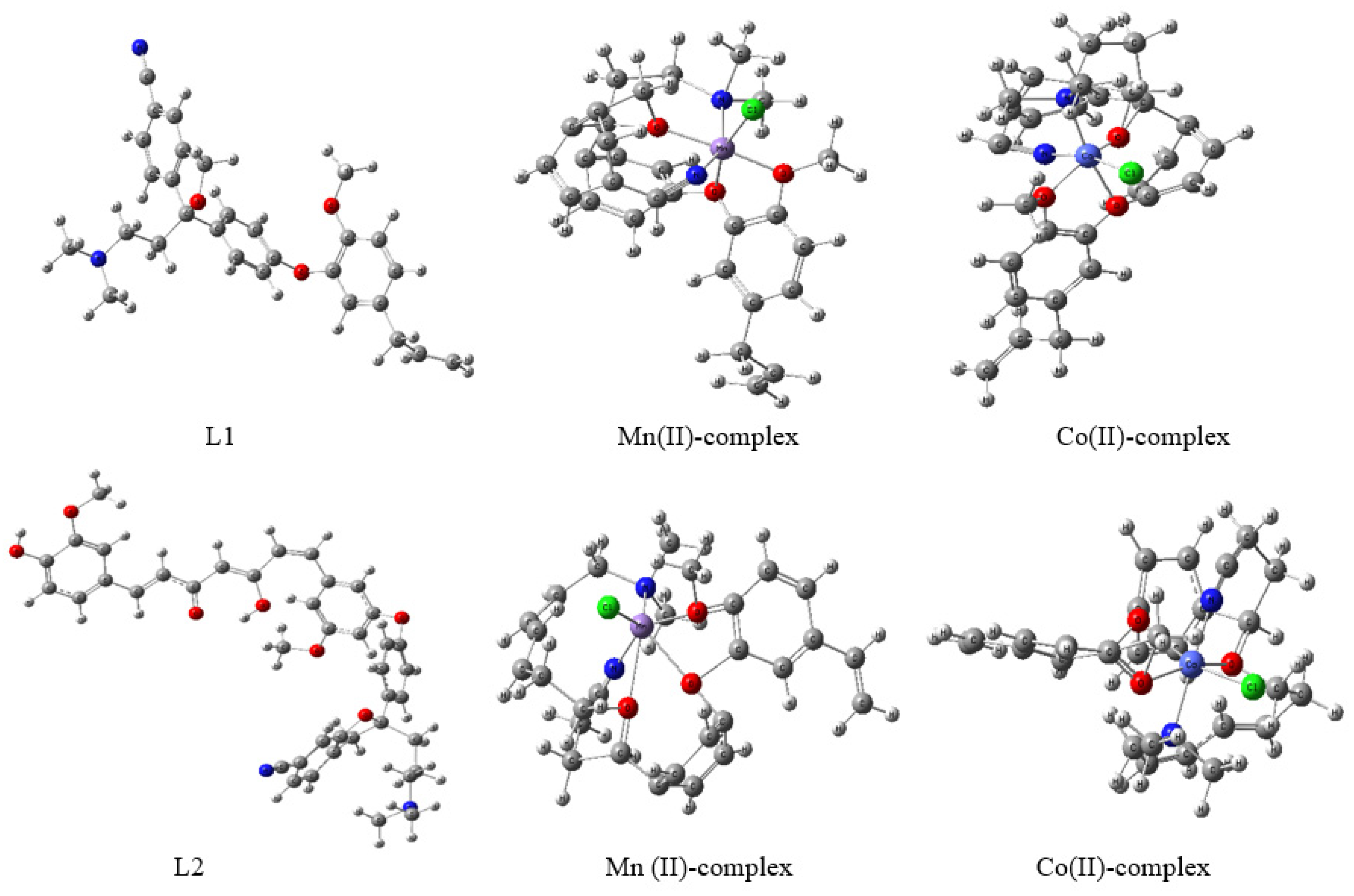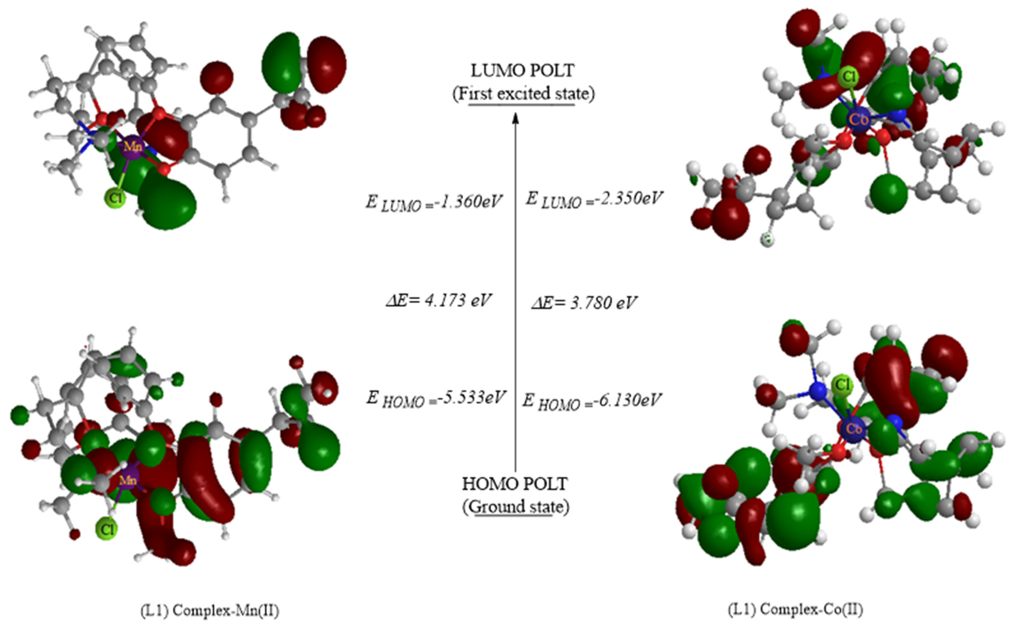 Mn(II)-complex | −5.627 | −1.460 | 4.167 | −3.544 | −3.544 | 2.082 | 0.240 | 3.013 | 1.652 |