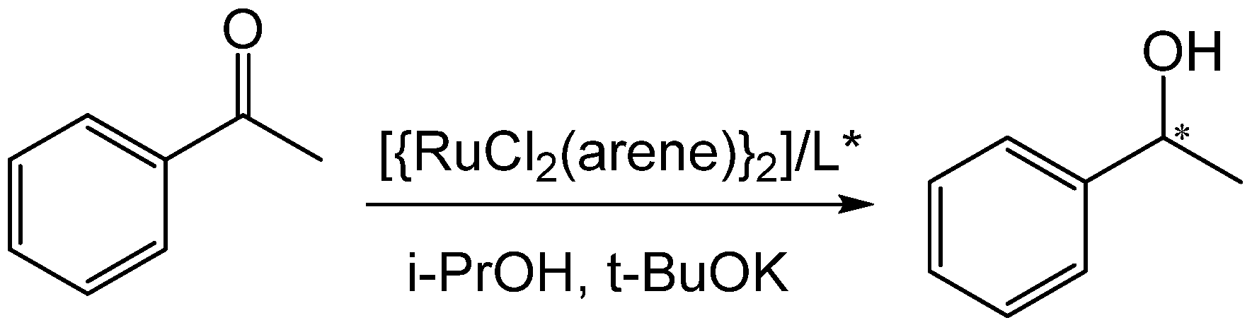 - Sandoval, C.A.; Ohkuma, T.; Utsumi, N.; Tsutsumi, K.; Murata, K.; Noyori, R. Mechanism of Asymmetric Hydrogenation of Acetophenone Catalyzed by Chiral H6-Arene–N-Tosylethylenediamine–Ruthenium(II) Complexes. Chem. Asian J. 2006, 1, 102–110. [Google Scholar] [CrossRef]
