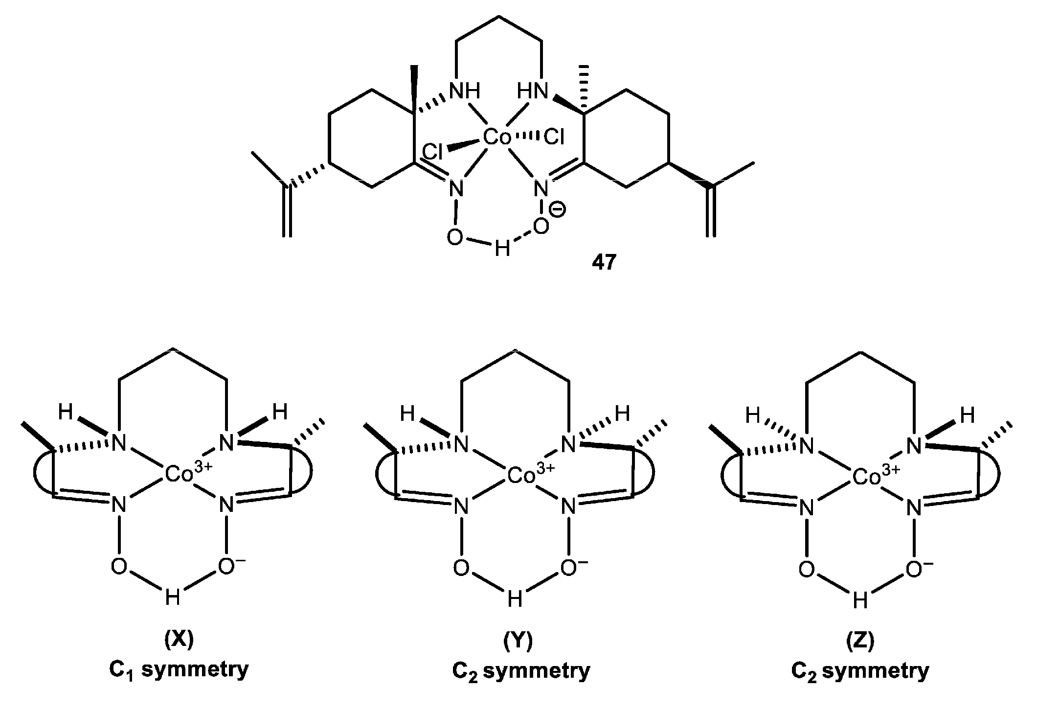 - Larionov, S.V.; Tkachev, A.V.; Savel’eva, Z.A.; Myachina, L.I.; Glinskaya, L.A.; Klevtsova, R.F.; Bizyaev, S.N. Co(III) Complexes with Optically Active Bis(Menthane), Pinano-Para-Menthane, Carano-Para-Menthane, and Bis(Carane) Propylenediaminodioximes. Russ. J. Coord. Chem. 2006, 32, 250–260. [Google Scholar] [CrossRef]
