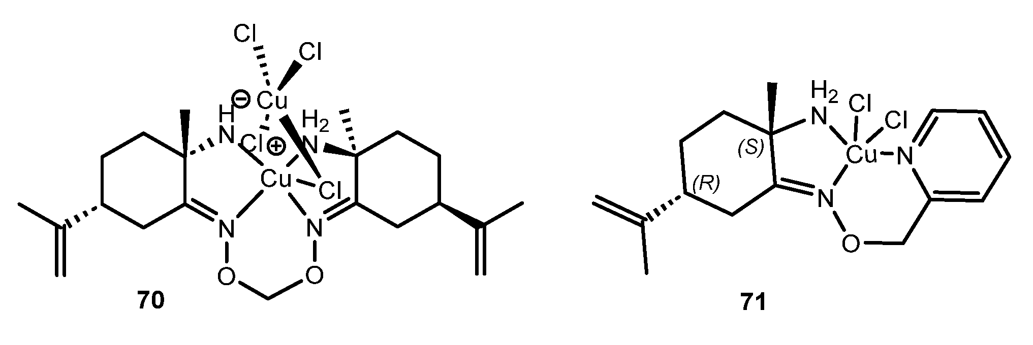 - Kokina, T.E.; Glinskaya, L.A.; Klevtsova, R.F.; Boguslavskii, E.G.; Sheludyakova, L.A.; Bisyaev, S.N.; Tkachev, A.V.; Larionov, S.V. Synthesis and Properties of the Cu(II) Complexes with Chiral Bis{(E)-[(1S,4R)-Δ7,8-1-Amino-2-Para-Menthalidene]Aminohydroxy}methane (L—A Derivative of Natural Terpenoid (R)-(+)-Limonene). Crystal Structure of the [Cu(L)(μ-Cl)CuCl3] · Iso-PrOH Solvate. Russ. J. Coord. Chem. 2009, 35, 200–209. [Google Scholar] [CrossRef]