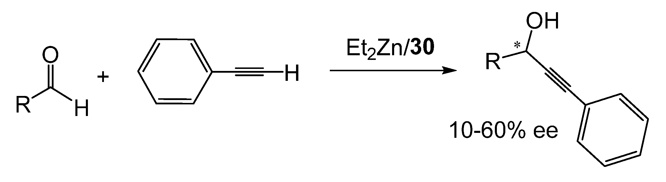 - Watts, C.C.; Thoniyot, P.; Hirayama, L.C.; Romano, T.; Singaram, B. Enantioselective Alkynylations of Aromatic and Aliphatic Aldehydes Catalyzed by Terpene Derived Chiral Amino Alcohols. Tetrahedron Asymmetry 2005, 16, 1829–1835. [Google Scholar] [CrossRef]