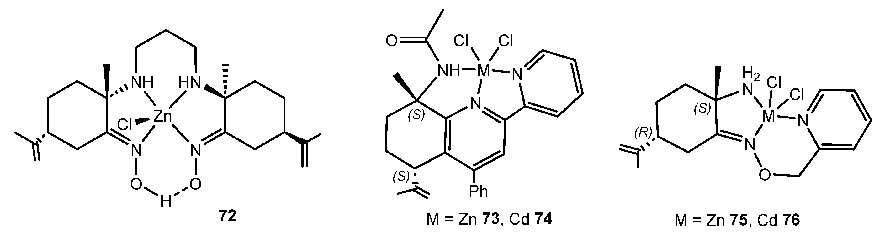 - Zalevskaya, O.A.; Gur’eva, Y.A.; Kutchin, A.V. Terpene Ligands in the Coordination Chemistry: Synthesis of Metal Complexes, Stereochemistry, Catalytic Properties and Biological Activity. Russ. Chem. Rev. 2019, 88, 979–1012. [Google Scholar] [CrossRef]