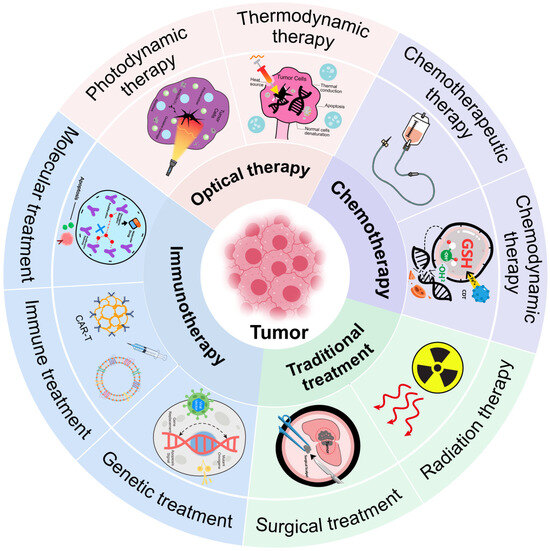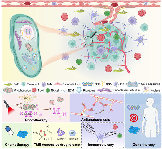 Traditional cancer therapies include surgery, chemotherapy, radiotherapy, and immunotherapy. Each has made important contributions to cancer care. However, their effectiveness is often reduced by the hostile and abnormal conditions of the TME. Chemotherapy drugs rely on blood flow to reach the tumor [4,14]. But in many tumors, the blood vessels are irregular and leaky. This makes drug delivery inefficient. Even when the drugs reach the tumor, acidic pH and high glutathione (GSH) levels can deactivate them. Radiotherapy is also less effective in hypoxic environments [15,16]. Oxygen is required to generate free radicals that damage cancer cell DNA. Without oxygen, radiation becomes significantly less lethal to tumor cells. Immunotherapies have revolutionized treatment for many cancers [17,18]. But they often fail in “cold” tumors, which lack active immune cell infiltration. The immunosuppressive TME further limits the activation of T cells, even after checkpoint blockade therapies. These challenges reveal a major problem. Conventional therapies are designed for normal tissues, not for the unique biology of tumors. The abnormal features of the TME create a protective shield around cancer cells. Overcoming this shield requires new therapeutic strategies that can adapt to or modify the TME itself.