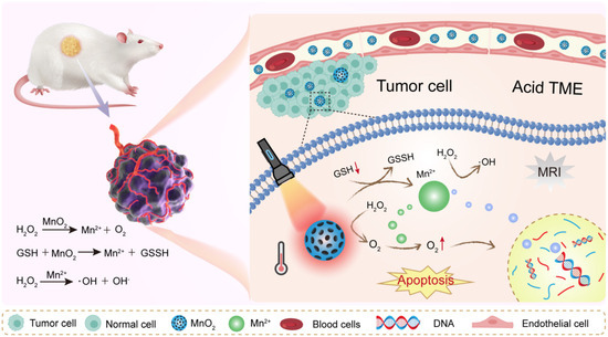 - Liang, L.; Jia, M.; Zhao, M.; Deng, Y.; Tang, J.; He, X.; Liu, Y.; Yan, K.; Yu, X.; Yang, H.; et al. Progress of Nanomaterials Based on Manganese Dioxide in the Field of Tumor Diagnosis and Therapy. Int. J. Nanomed. 2024, 19, 8883–8900. [Google Scholar] [CrossRef]