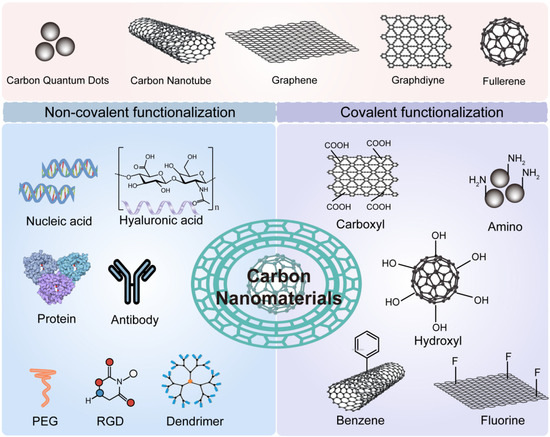 Schematic of Carbon Nanomaterial Functionalization. Carbon nanomaterials can be functionalized via covalent or non-covalent approaches using diverse chemical groups and biomolecules. This modification enhances their anticancer therapeutic efficacy.