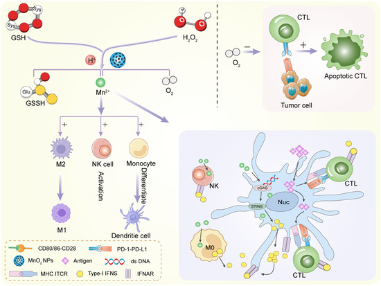 - Liang, X.; Wang, D.; Zhao, Y.; Wang, X.; Yao, S.; Huang, W.; Yang, Y.; Dong, X.; Zhang, L.; Yang, J. Tumor microenvironment-responsive manganese-based nano-modulator activate the cGAS-STING pathway to enhance innate immune system response. J. Nanobiotechnol. 2024, 22, 535. [Google Scholar] [CrossRef] [PubMed]