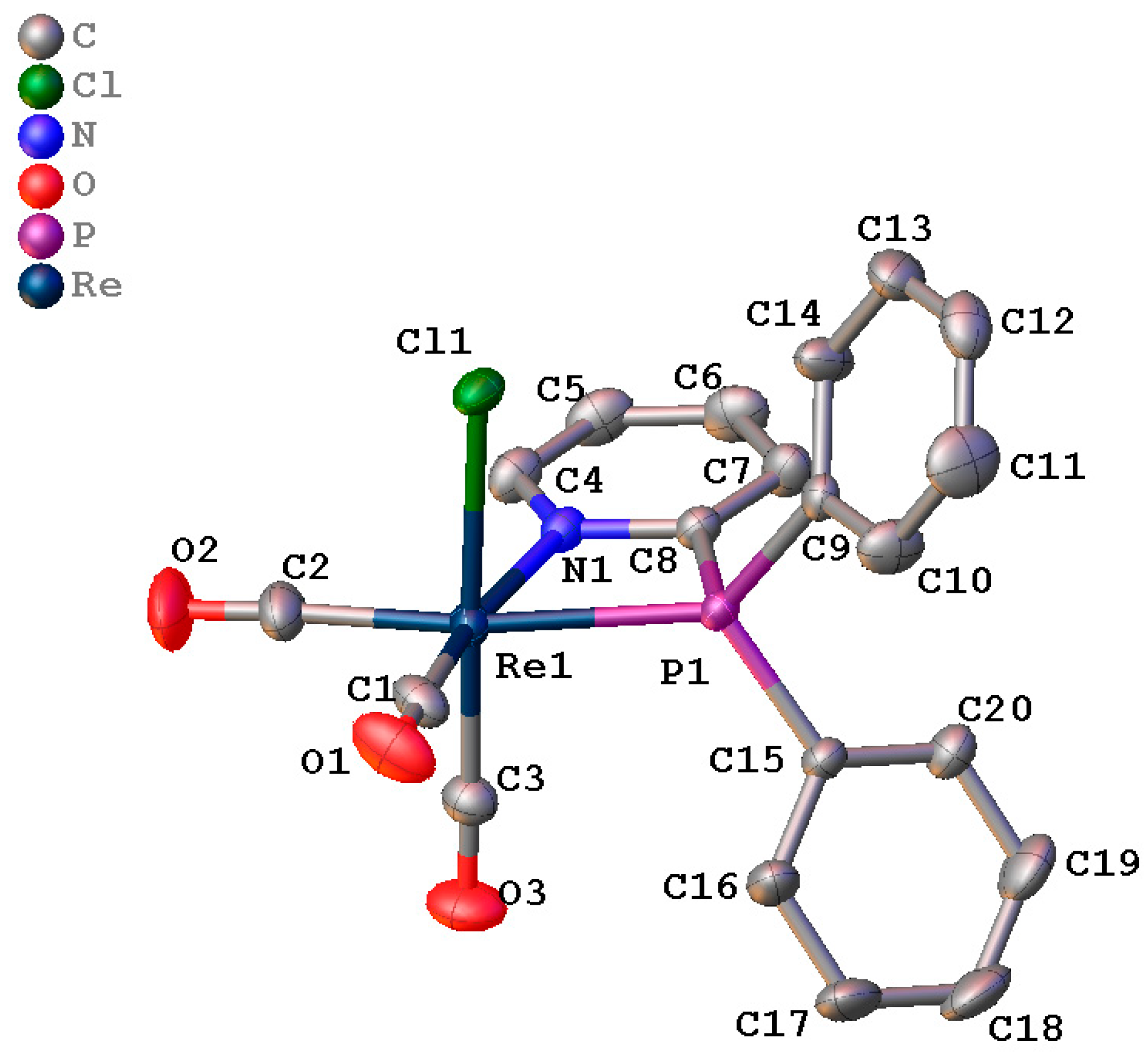 2.3. X-Ray Crystal Structure Determination for Fac-[Re(CO)3(PN)Cl] Complex