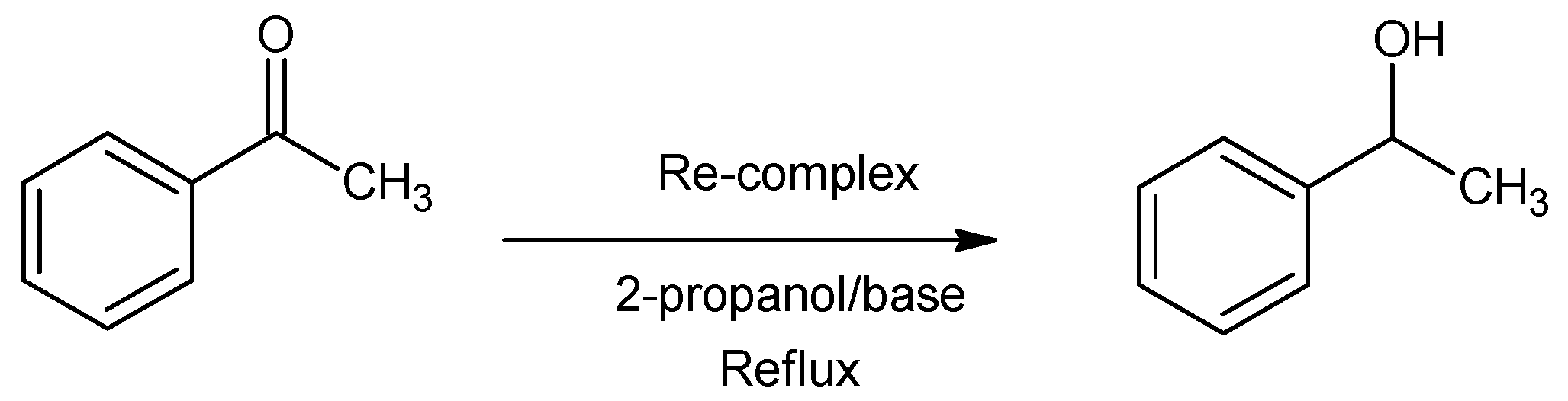 - Landwehr, A.; Dudle, B.; Fox, T.; Blacque, O.; Berke, H. Bifunctional Rhenium Complexes for the Catalytic Transfer-Hydrogenation Reactions of Ketones and Imines. Chem.—Eur. J. 2012, 18, 5701–5714. [Google Scholar] [CrossRef]