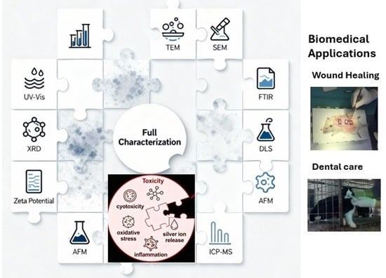 - Naganthran, A.; Verasoundarapandian, G.; Khalid, F.E.; Masarudin, M.J.; Zulkharnain, A.; Nawawi, N.M.; Karim, M.; Che, A.; Che, A.; Ahmad, S. Synthesis, Characterization and Biomedical Application of Silver Nanoparticles. Materials 2022, 15, 427. [Google Scholar] [CrossRef]