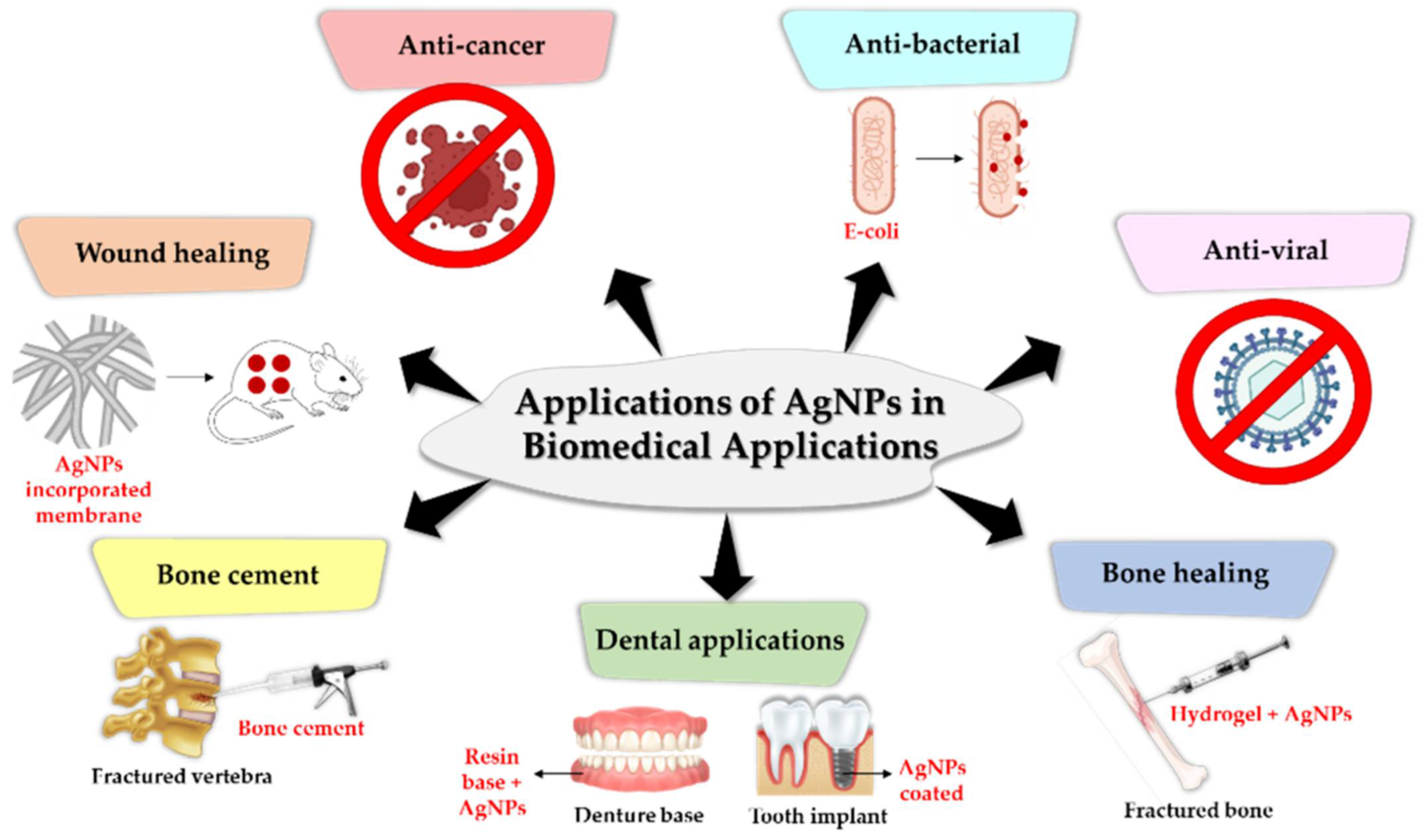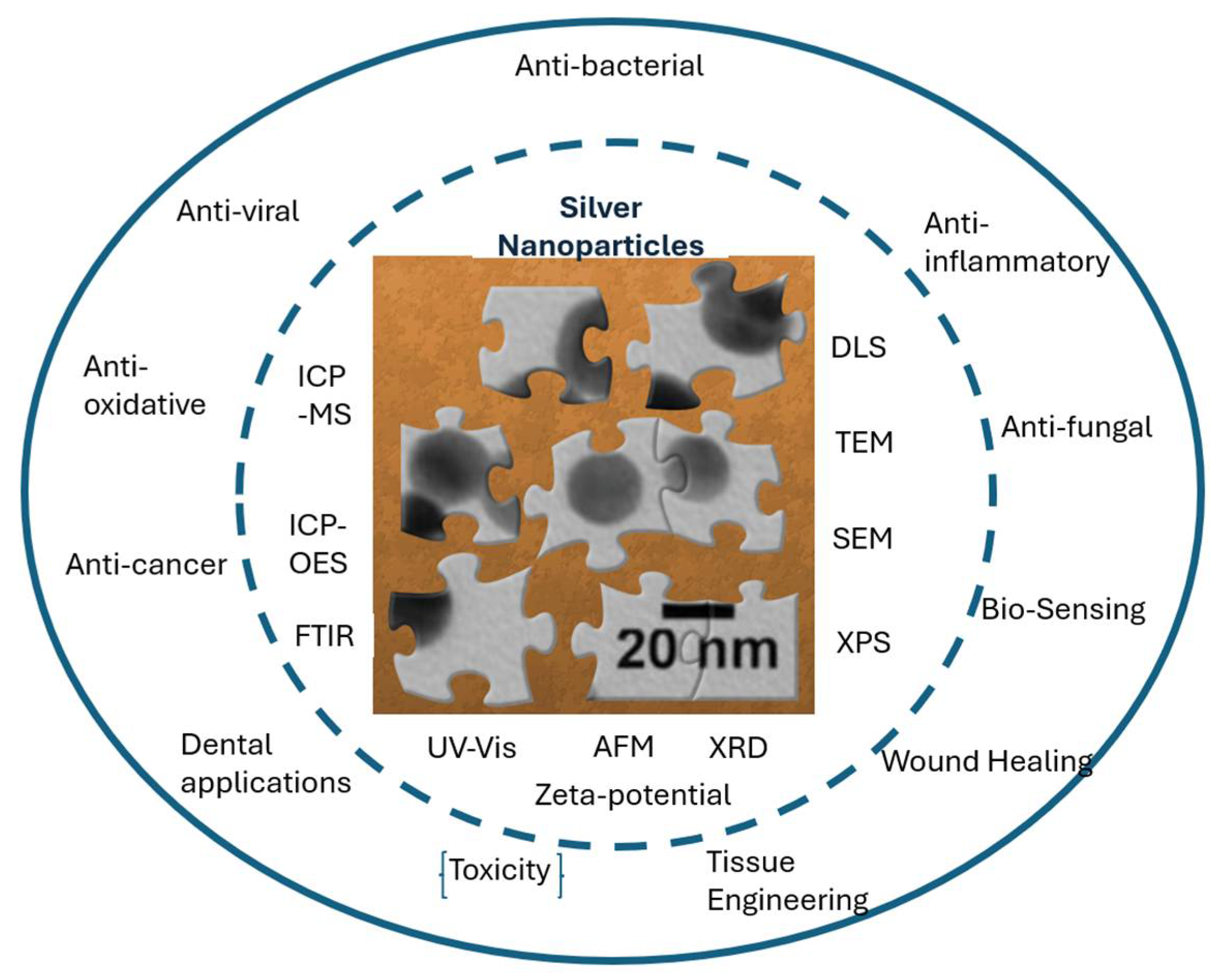 - Cao, W.; Tang, G.; Zhao, C.; Li, J.; Wang, Y. Silver nanoparticles: Comprehensive insights into bioanalytical and biomedical applications. ACS Omega 2025, 10, 1234–1245. [Google Scholar]