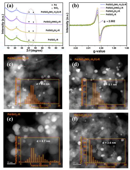 (a) XRD patterns, (b) ESR spectra, (c) Pd/SiO2-R, (d) Pd/SiO2 (H2)-R, (e) Pd/SiO2 (HNO3)-R, and (f) Pd/SiO2 (NH3·H2O)-R catalysts. This figure has been adapted from a previous reference [79].