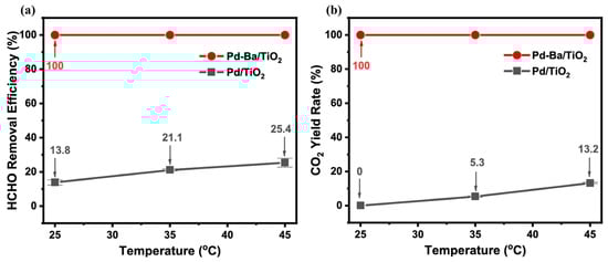 HCHO removal efficiency (a) and CO2 yield rate (b) of Pd/TiO2 and Pd-Ba/TiO2. This figure has been adapted from a previous reference [77].