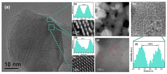 AC-TEM of Pd-Ba/TiO2 catalyst (a); locally enlarged image of carrier edge (b,c); partial enlargement of the bulk phase (d,e); monatomic regions and basal lattice fringes (f,g); HRTEM of the Pd-Ba/TiO2 catalyst (h,i). The red circles indicate the location of single-atom Pd. This figure has been adapted from a previous reference [77].