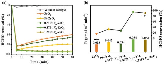(a) HCHO removal as a function of reaction time and (b) HCHO conversion and the specific reaction rates over ZrO2 and 1.32 Pt-Vo-ZrO2 samples. The arrow to the left represents the reaction rate constant (R) of the material, and the arrow to the right represents the formaldehyde removal rate of the material. This figure has been adapted from a previous reference [81].