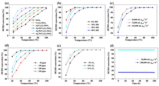 HCHO oxidation of the analyzed catalysts: (a) Effect of reaction temperature. (b) Effect of RH. (c) Effect of WHSV. (d) Effect of HCHO concentration. (e) Effect of O2 concentration. (f) Continuous experiment of HCHO oxidation on Ag-5K/Co3O4-MnO2 catalyst at 50 °C under condition of 150 ppm HCHO, 21 vol% O2/N2, RH =30% or 80%, WHSV =36,000 or 288,000 mL/(g·h)). Error bars represent the standard deviation of three runs. This figure has been adapted from a previous reference [88].