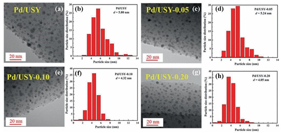 (a,c,e,g) TEM images of the Pd/USY, Pd/USY-0.05, Pd/USY-0.10, and Pd/USY-0.20 catalysts. (b,d,f,h) particle size distributions of the Pd/USY, Pd/USY-0.05, Pd/USY-0.10, and Pd/USY-0.20 catalysts. This figure has been adapted from a previous reference [74].
