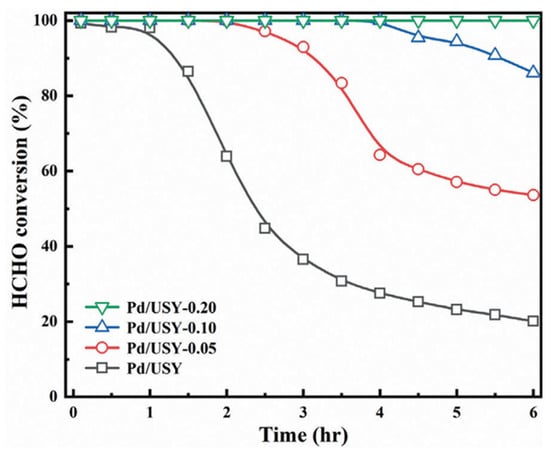 HCHO conversion over Pd/USY, Pd/USY-0.05, Pd/USY-0.10, and Pd/USY-0.20 catalysts. This figure has been adapted from a previous reference [74].