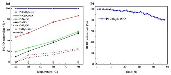 (a) Catalytic activities for HCHO oxidation for the samples. Reaction conditions: 100 ppmV of HCHO, GHSV = 80,000 mL/(g·h), and RH = 35%. (b) Stability test of Pt-CeO2/N-rGO. Reaction conditions: T = 30 °C, 100 ppmV of HCHO, GHSV = 80,000 mL/(g·h), and RH = 35%. This figure has been adapted from a previous reference [71].