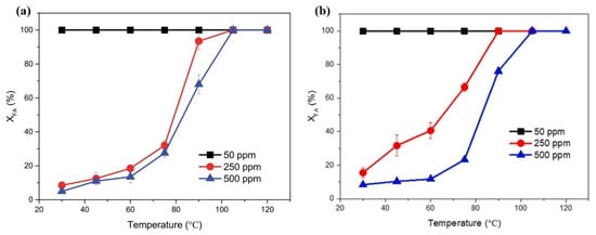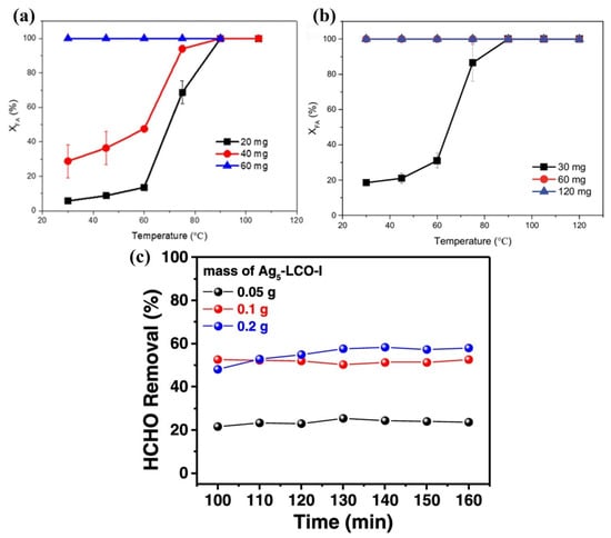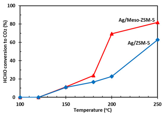 Nguyen et al. [72] used Ag nanoparticles as the active phase to systematically investigate the key role of mesoporous scale regulation in the oxidation of formaldehyde (HCHO) using ZSM-5 molecular sieve as the carrier. Through a three-step method of alkali de-silication, ion exchange, and chemical reduction, they constructed the Ag/Meso-ZSM-5 and Ag/ZSM-5 control systems. Figure 14 shows the relationship between the complete conversion rate of HCHO and temperature in the Ag/ZSM-5 and Ag/Meso-ZSM-5 catalysts under a relative humidity of 65%. In both Ag/Meso-ZSM-5 and Ag/ZSM-5, the catalyst activity was not observed until the temperature exceeded 120 °C. When the temperature exceeded 120 °C, Ag/Meso-ZSM-5 exhibited better catalytic performance than Ag/ZSM-5. Particularly at 200 °C, the proportion of HCHO converting to CO2 on Ag/Meso-ZSM-5 reached 70%, while the conversion rate shown by Ag/ZSM-5 was only 20%. This work first quantitatively correlated diffusion limitation with adsorption-desorption behavior, providing a reference structure-activity relationship for catalytic reactions of HCHO at low- and medium-temperature. Therefore, it can be seen that for catalyst carriers of the molecular sieve type, pre-treatment can significantly improve the catalyst’s activity.