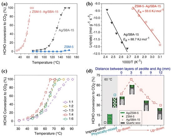 Bifunctionality of ZSM-5−Ag/SBA-15, ZSM-5, and Ag/SBA-15 catalyst in HCHO conversion to CO2. (a) HCHO conversion to CO2. (b) Reaction activation energy, Ea. Individual ZSM-5 and Ag/SBA-15 components are listed for comparison. (c) Effect of mass ratio of ZSM-5 zeolite to Ag/SBA-15 component and (d) intimacy of the two components in composites. Reaction conditions: 60 °C, 100 ppm HCHO, 20% O2-Ar, and gas hourly space velocity (GHSV) with respect to ZSM-5−Ag/SBA-15 bifunctional catalysts is 36,000 mL/(g·h). This figure has been adapted from a previous reference [73].