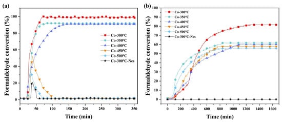 Under what circumstances should a single metal oxide catalyst be selected? The answer is high temperature (>80 °C), short operating period (<24 h), and high concentration (instantaneous concentration 200–1000 ppm). Jiao et al. [98] employed a two-step method of electrospinning and temperature-controlled sintering to prepare a Co3O4 porous nanofiber monolithic catalyst (labeled as Co-300 °C). As shown in Figure 16a,b, Co-300 °C exhibited the highest catalytic oxidation activity for HCHO, achieved a removal rate of 99% within 60 min, and maintained a conversion rate of 81.6% within 1600 min.