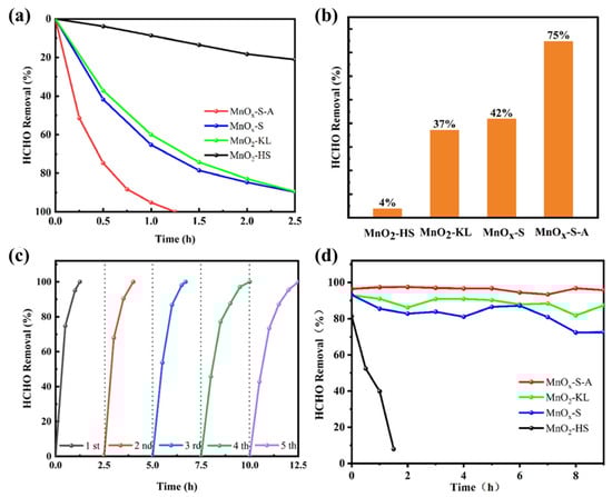 (a) HCHO removal rate of MnO2-HS, MnO2-KL, MnOx-S, and MnOx-S-A in a static test (216L, ~1 ppm of HCHO). (b) HCHO removal rate after 0.5 h of the starting reaction for MnO2-HS, MnO2-KL, MnOx-S, and MnOx-S-A. (c) Corresponding HCHO removal on MnOx-S-A in five cycles. (d) HCHO removal rate of MnO2-HS, MnO2-KL, MnOx-S, and MnOx-S-A in a dynamic test (GHSV = 150 L/(g·h), ~1 ppm of HCHO, RH = 55%). This figure has been adapted from a previous reference [95].