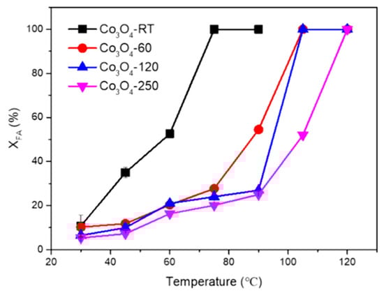 FA removal performance of the analyzed Co3O4 catalysts. Light-off curves (FA: 50 ppm in air, WHSV: 100,000 mL/(g·h), H2O content: 0, and O2 concentration: 21% (air)). Error bars represent the standard deviation of two runs. This figure has been adapted from a previous reference [107].