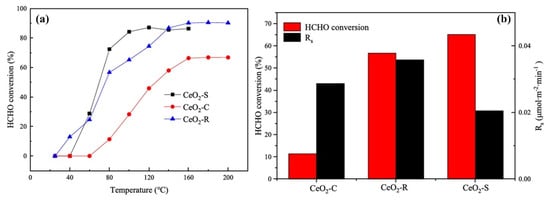 (a) Catalytic activity of CeO2 with different morphologies in HCHO oxidation. (b) Normalized reaction rates based on specific surface areas at 80 °C. Reaction conditions: [HCHO] = 500 ppm, total flow rate = 40 mL/min, GHSV = 10,000 mL/(g·h). This figure has been adapted from a previous reference [108]. CeO2-S, CeO2-C, and CeO2-R represent spherical, cubic, and rod morphologies of cerium oxide, respectively.
