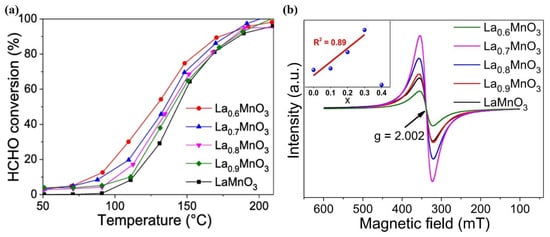 HCHO catalytic oxidation over the La1-xMnO3 series (x = 0–0.4): (a) HCHO conversion into CO2 and (b) EPR spectra of the La1-xMnO3 series (x = 0–0.4). Inset: linear relationship between the amount of oxygen vacancies and the La-deficiency. This figure has been adapted from a previous reference [109].