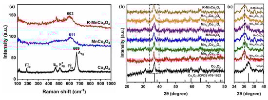 (a) Raman spectra of Co3O4, MnCo2O4, and R-MnCo2O4 and (b,c) XRD patterns. This figure has been adapted from a previous reference [110]. Figure c is cited from previous publications, and there is no clearer version, please keep it.