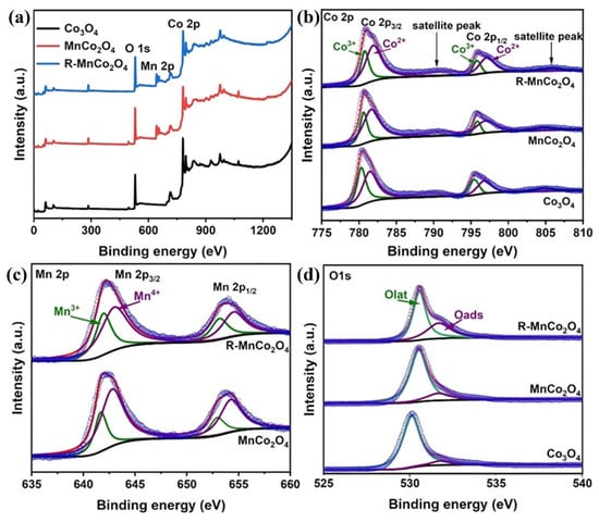 (a) XPS spectra of Co3O4, MnCo2O4 and R-MnCo2O4, (b) Co 2p, (c) Mn 2p and (d) O 1s. This figure has been adapted from a previous reference [110].