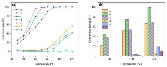 HCHO removal degree (a) and conversion degree (b) of 10Mn/Mg1Al1-LDH. a, b, c, d, e, f, g represents 10Mn/Mg3Al1-LDH, 10Mn/Mg5Al1-LDH, Mg1Al1-LDH, Mg3Al1-LDH, Mg5Al1-LDH, and blank, respectively. This figure has been adapted from a previous reference [111].