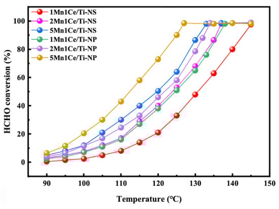 Catalytic activity tests for 1Mn1Ce/Ti-NS, 2Mn1Ce/Ti-NS, 5Mn1Ce/Ti-NS, 1Mn1Ce/Ti-NP, 2Mn1Ce/Ti-NP, and 5Mn1Ce/Ti-NP. This figure has been adapted from a previous reference [112].