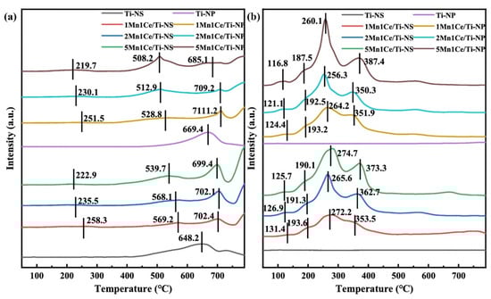 (a) O2-TPD and (b) H2-TPR curves for Ti-NS, 1Mn1Ce/Ti-NS, 2Mn1Ce/Ti-NS, 5Mn1Ce/Ti-NS, Ti-NP, 1Mn1Ce/Ti-NP, 2Mn1Ce/Ti-NP, and 5Mn1Ce/Ti-NP. This figure has been adapted from a previous reference [112].