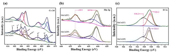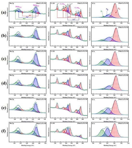 (a–f) Ce 3d, Mn 2p and O 1 s spectra of 1Mn1Ce/Ti-NS, 2Mn1Ce/Ti-NS, 5Mn1Ce/Ti-NS and 1Mn1Ce/Ti-NP, 2Mn1Ce/Ti-NP, 5Mn1Ce/Ti-NP. This figure has been adapted from a previous reference [112].