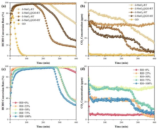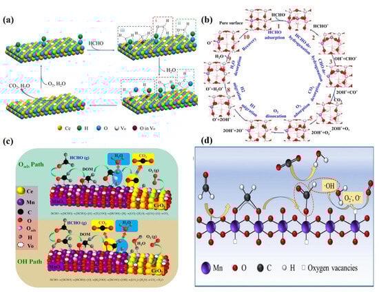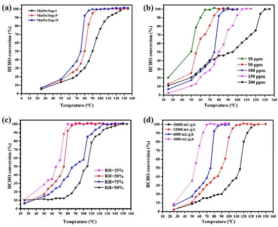 The performance of the catalytic oxidation of HCHO. (a) The catalytic activity of MnOX/Sep-H, MnOX/Sep-P, and MnOX/Sep-I; (b) Effects of different HCHO concentrations on catalytic oxidation of HCHO over MnOX/Sep-H; (c) Effects of different reaction humidity on catalytic oxidation of HCHO over MnOX/Sep-H; (d) Effects of different GHSV on MnOX/Sep-H catalyst activity. This figure has been adapted from a previous reference [101].