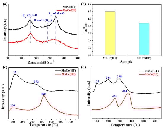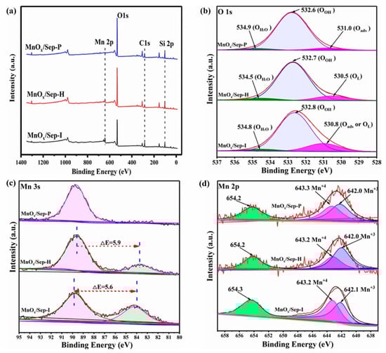 Li et al. [101] prepared MnOX/Sep-I, MnOX/Sep-H, and MnOX/Sep-P by the impregnation, hydrothermal, and precipitation methods. It is a material synthesis method that is widely used nowadays. As shown in Figure 28a, the comparison of catalyst activity among the three different preparation methods reveals that Sep-H has the best activity (100% at 85 °C). Figure 28b–d indicate the catalytic activity of Sep-H under different concentrations, humidity, and space velocities. The data show that as the concentration, humidity, and space velocity increase, a higher temperature is required to achieve 100% conversion. Figure 29 represent the H2-TPR, O2-TPD, and CO2-TPD of three catalysts. From the H2-TPR profiles in Figure 29a, the low-temperature peak of Sep-H is the lowest (202 °C), indicating that its surface oxygen is the easiest to be reduced, which is beneficial for the oxidation of HCHO. The O2-TPD spectrum in Figure 28b shows that Sep-H has a lower-temperature peak, indicating that its surface oxygen activation ability is the strongest and it is the key active site for the reaction. The CO2-TPD spectrum in Figure 28c shows that the peak temperature of Sep-H is the lowest (201 °C) and the intensity is the highest, which is conducive to the desorption of CO2 products and prevents the blocking of active sites, thereby improving stability. Figure 30a represents the XPS full spectrum of the catalyst, which is used to confirm all the elements contained in the catalyst. Figure 30b shows that the three oxygen species are lattice oxygen, adsorbed oxygen, and hydroxyl; Figure 30c is the Mn 3s spectrum, which is used to calculate the active oxygen species and obtain the data Sep-H as the highest 2.31, thereby generating more Mn vacancies; Figure 30d is the Mn 2p spectrum, indicating the ratio of Mn3+/Mn4+, and from the fitted data it is concluded that Sep-H’s Mn3+/Mn4+ = 1.67:1, indicating that a high proportion of Mn3+ can promote the formation of oxygen vacancies.