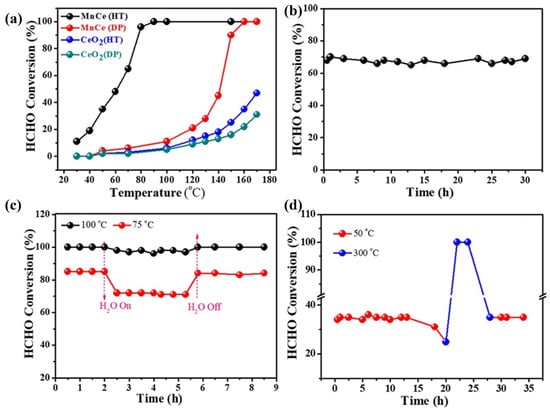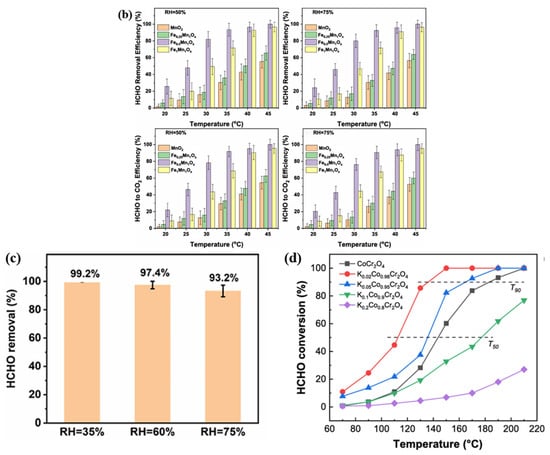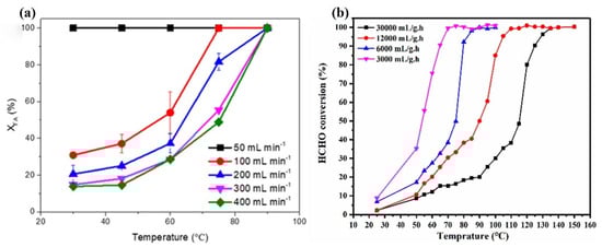 Hua et al. [107] investigated the influence of the hydrothermal synthesis temperature on the performance of Co3O4 in catalyzing the oxidation of gaseous formaldehyde. As shown in Figure 18, the activity of the catalyst was tested under different reaction conditions. The Co3O4-RT catalytic activity is the best in an environment with low HCHO concentration, low flow rate, and no water. The Co3O4 synthesized at room temperature (Co3O4-RT) exhibits excellent catalytic oxidation performance for formaldehyde at low temperatures due to its high Co3+ content, abundant oxygen vacancies, good oxygen migration property, and exposed (111) active crystal faces. Moreover, it is cost-effective and has practical application potential.