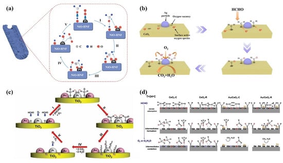 Formaldehyde (HCHO or CH2O), also known as formic aldehyde, is a typical VOC pollutant. It generally has two states: gaseous and liquid. In a liquid state, a 35–40% formaldehyde water solution is the well-known formalin solution. In the gaseous state, low-concentration formaldehyde is a colorless and odorless gas, while high-concentration formaldehyde has a strong, pungent, and suffocating smell, which can irritate the eyes, nose, etc. It primarily originates from furniture, decoration materials, textiles, and fabric products, among others [1,2,3]. HCHO is seriously harmful to human health and the ecosystem, and long-term exposure to HCHO can cause headaches, pneumonia, and even cancer [4]. The International Agency for Research on Cancer classifies HCHO as a Group I carcinogen [5]. So, how to effectively remove formaldehyde has become extremely urgent. In recent years, various methods for removing formaldehyde have been reported, such as plant adsorption [6], physical and chemical absorption [7,8,9], photocatalytic oxidation [10,11,12,13,14,15,16], thermal catalytic oxidation [17,18,19,20,21,22,23,24,25,26,27], and photothermal catalytic oxidation [28,29].