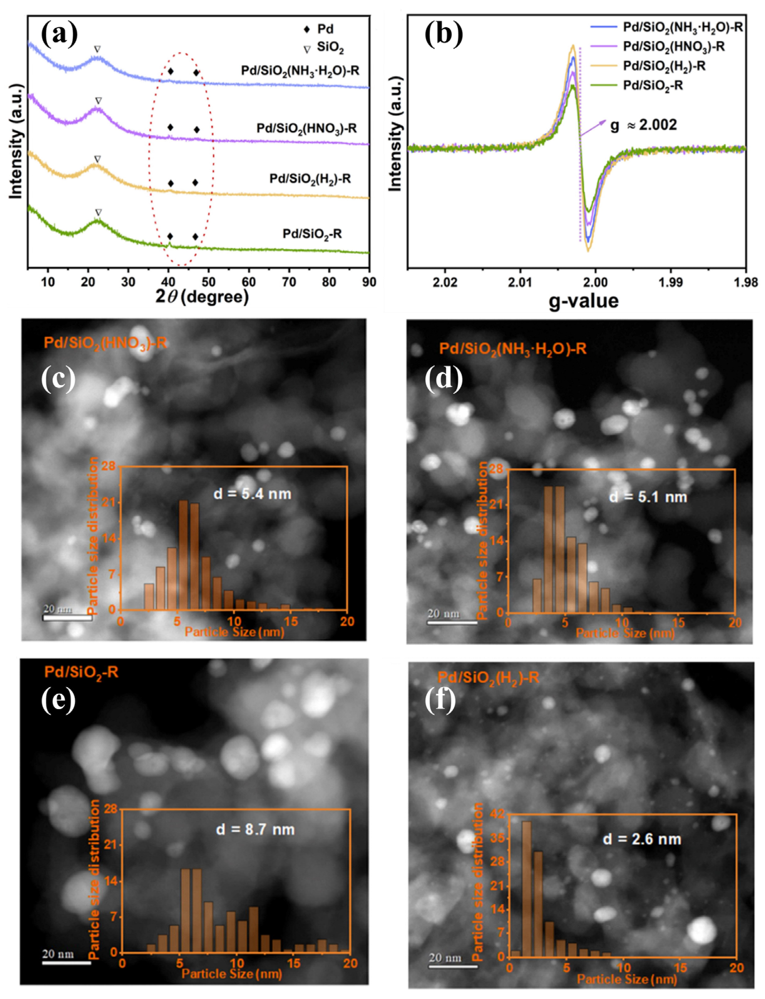 Precious metals are loaded onto metal oxide supports for HCHO catalytic oxidation through impregnation methods, one-pot methods, or other preparation techniques. Here is an introduction to researchers’ findings. In Liu’s work [79], after pre-treating SiO2, Pd was loaded onto it through the impregnation method. After the acid-base etching and H2 treatment, as can be seen from Figure 2a, the broad diffraction peak centered at 22° is an amorphous silica structure, and the two diffraction peaks at 40.1° and 46.7° correspond to the metal Pd species. Figure 2b shows that the oxygen vacancies increase, and Figure 2c–f shows that the defect anchoring inhibits sintering and promotes the high dispersion of Pd. This study has, for the first time, revealed the water inhibition phenomenon: the traditional understanding has been overturned, indicating that what determines the catalytic activity is the ability to generate hydroxyl groups, rather than the total amount of hydroxyl groups. As shown in Figure 3, after pretreatment of the SiO2 support with H2 reduction, HNO3, or NH3·H2O solution, the catalytic performance of all Pd/SiO2 catalysts in formaldehyde oxidation was significantly enhanced. Specifically, the removal efficiencies were 4% for Pd/SiO2-R, 59% for Pd/SiO2(HNO3)-R, 94% for Pd/SiO2(NH3·H2O)-R, and 100% for Pd/SiO2(H2)-R. Among them, Pd/SiO2(H2)-R demonstrated the highest activity for HCHO oxidation.
