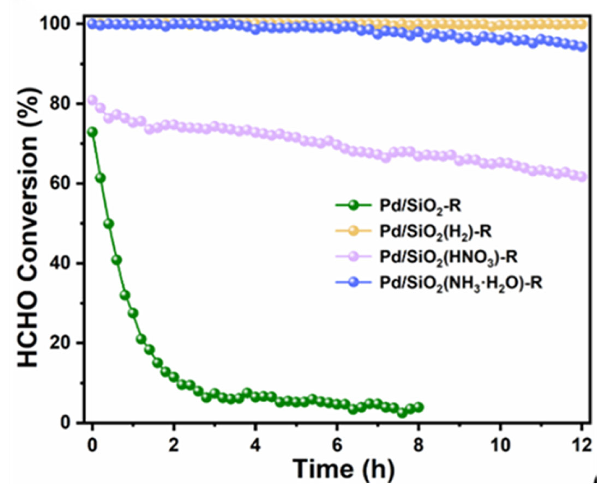 Pd/SiO2(H2)-R150 ppm HCHO, 20 vol.% O2, total flow rate = 100 mL/min RH = 35%100% at 25[79]