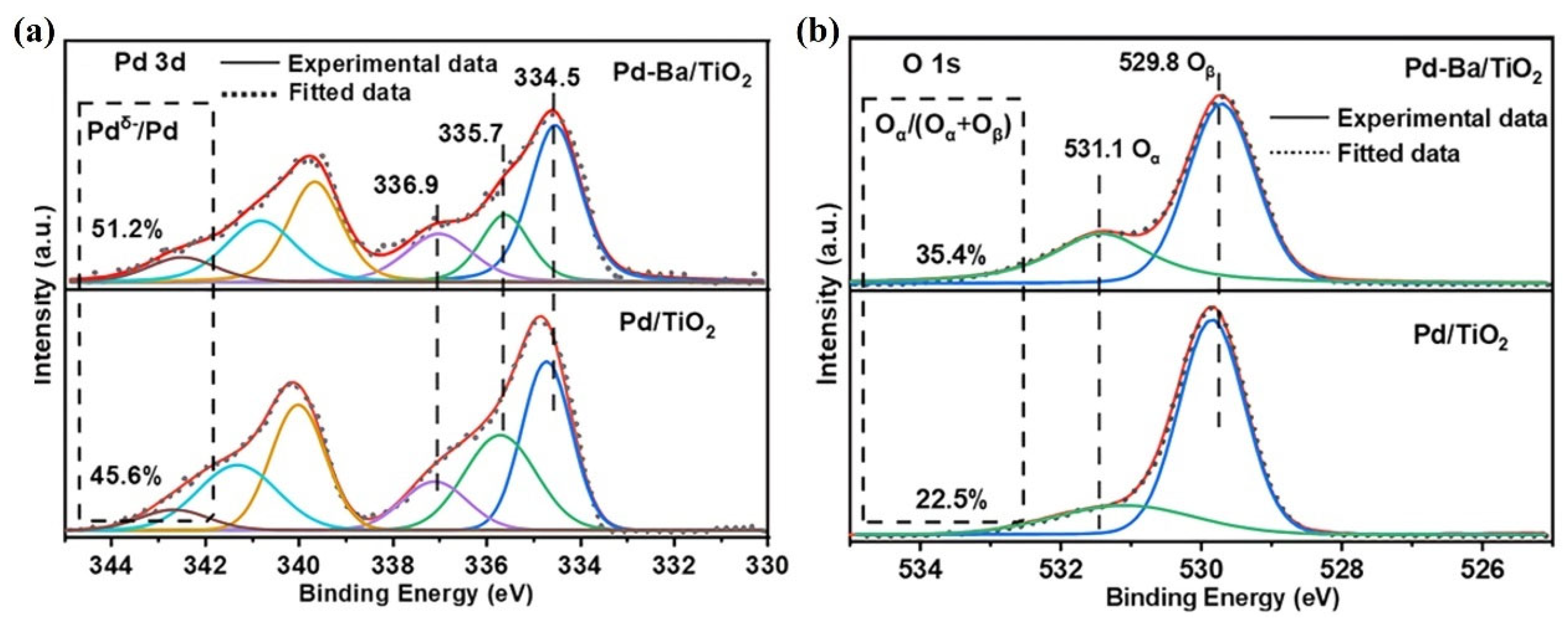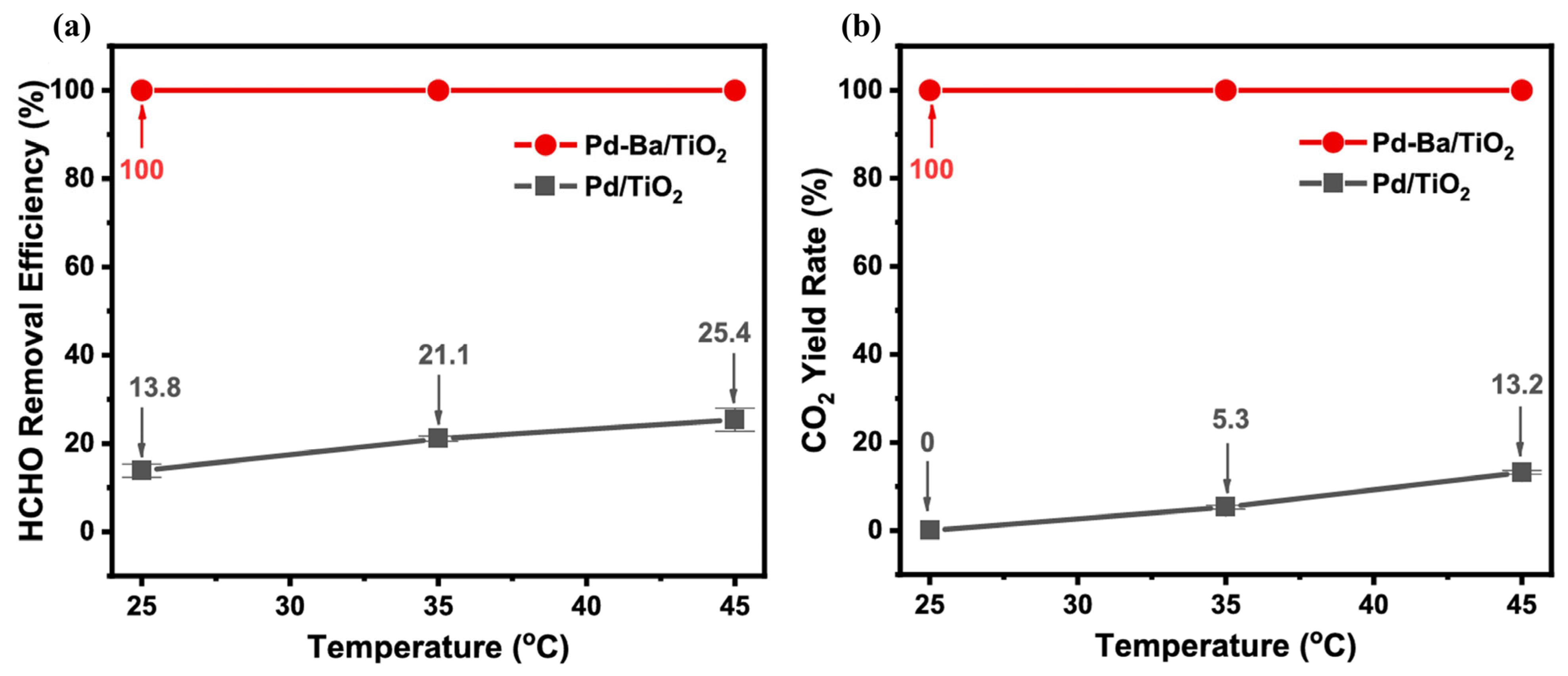 Chen et al. [77] prepared the 1Pd-Ba/TiO2 catalyst using the impregnation method. As can be seen from the Figure 4, after adding the alkaline earth metal Ba, both the conversion removal efficiency of formaldehyde (13.8% to 100% at 25 °C) and the yield of carbon dioxide (0 to 100% at 25 °C) increased significantly, there are a large number of single-atom Pd (marked in red in Figure 5g), which is attributed to the fact that Ba inhibited sintering. This is a significant improvement for noble metal catalysts. From Figure 6, it can be observed that new Pdδ− (334.5 eV, 51.2%) has been formed, which is due to the electron transfer from Ba-O-Pd and a significant increase in chemisorbed oxygen (22.5–35.4%). Alkali metals (such as Na+ and K+) have been proven to enhance activity through the electron donor effect. However, the mechanism of action of alkaline earth metals (such as Ba and Ca) in the oxidation of formaldehyde remains unexplored. In the future, research can be conducted on how to utilize alkaline earth metals (Ba) as electronic auxiliaries to regulate the electronic structure of noble metal atoms, stabilize single atoms/tuples, and optimize the O2 activation pathway, thereby achieving efficient room-temperature formaldehyde oxidation without increasing the number of noble metals.