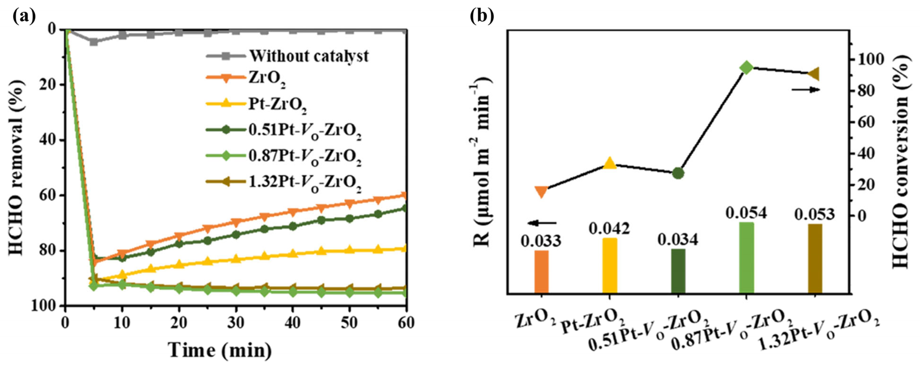Peng et al. [81] prepared Pt/ZrO2 by a modified P123-assisted hydrothermal method [89]. P123 is the abbreviation of polyethylene oxide-polypropylene oxide-polyethylene oxide triblock copolymer (PEO20-PPO70-PEO20), which is a nonionic surfactant commonly used as a template for the synthesis of mesoporous molecular sieves (such as SBA-15). Figure 7 indicates that the optimized Pt-VO-ZrO2 with Pt contents of 0.87 wt.% could display HCHO removal and HCHO conversion (>95%) for 720 min at 20 °C, higher than that of Pt-ZrO2 and ZrO2. Moreover, the concentration of HCHO could be reduced from about 1 ppm to below 0.05 ppm after 580 min. This work first proposed the oxygen vacancy (VO)-controlled surface metal-support interaction (SMSI) interface (Pt-VO-ZrO2) for room-temperature formaldehyde oxidation. Furthermore, it was found that VO on the surface of ZrO2 captures and activates O2, generating O* (with an activation energy of only 0.3 eV). O* acts as an electron transport channel, accelerating the oxidation path of HCHO → formate → CO2.