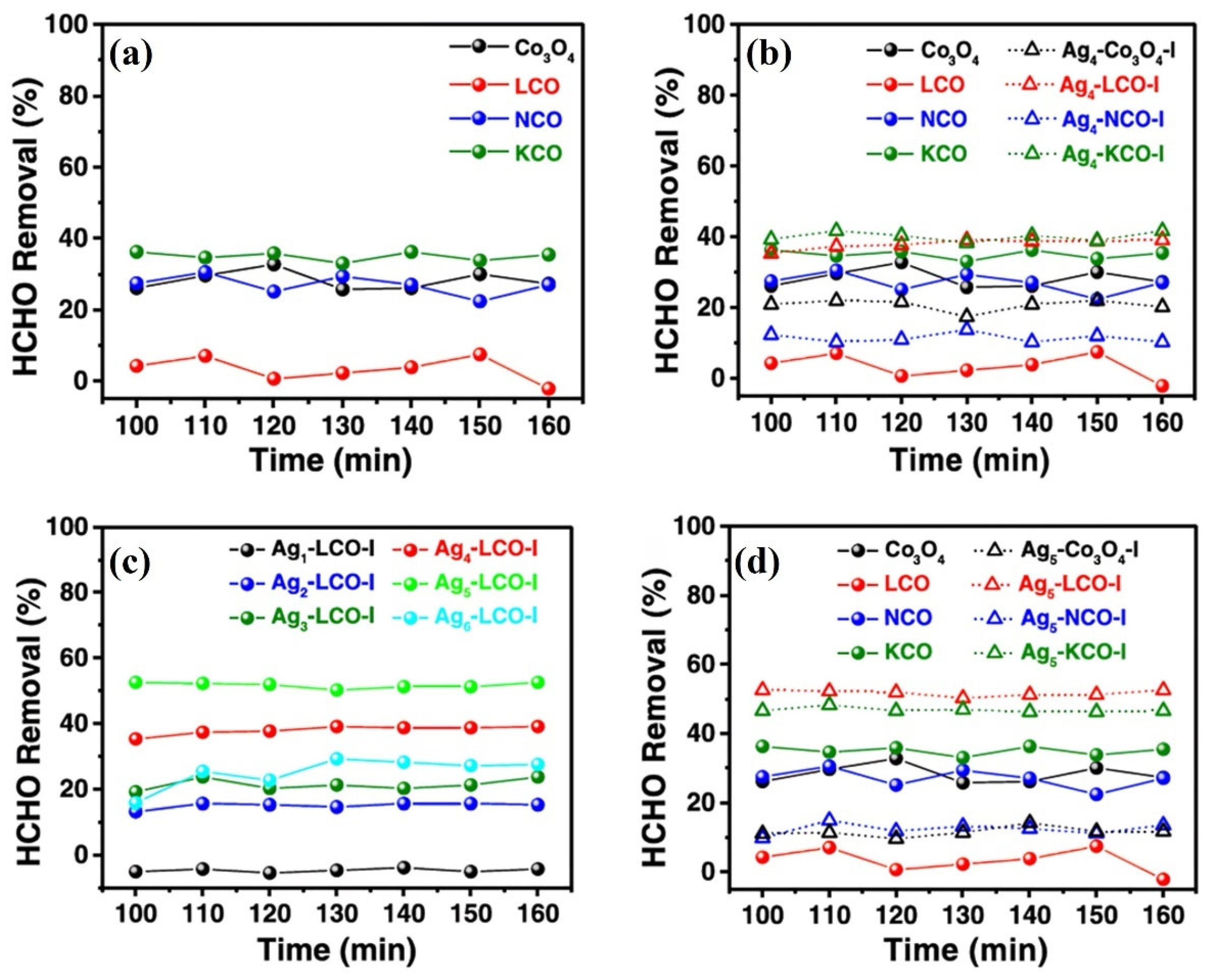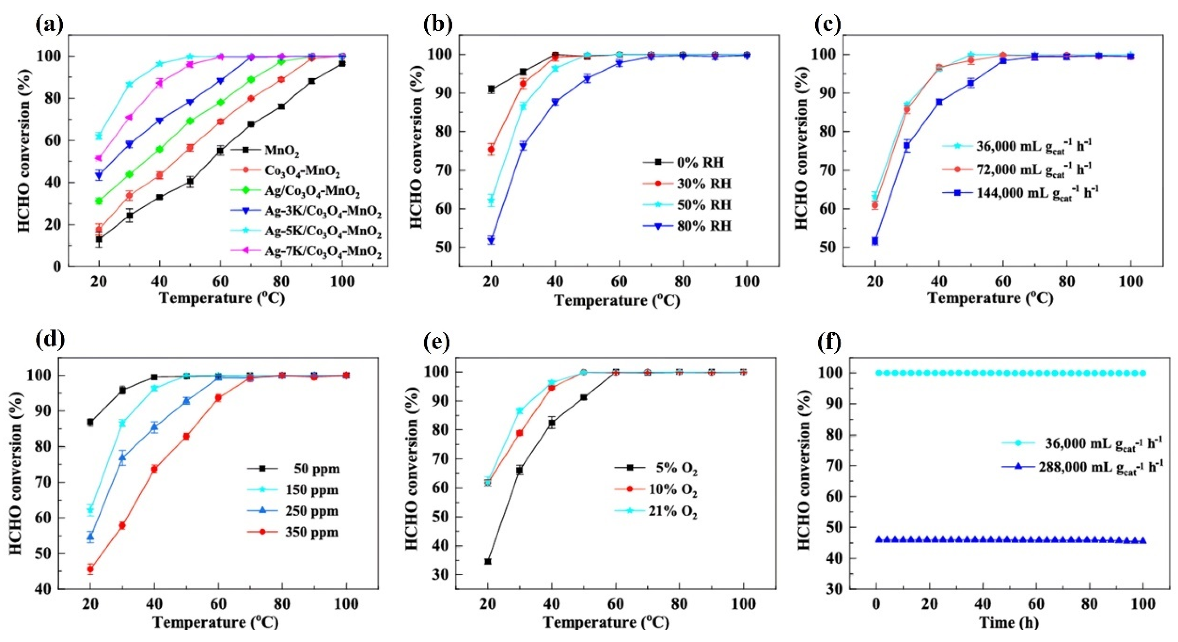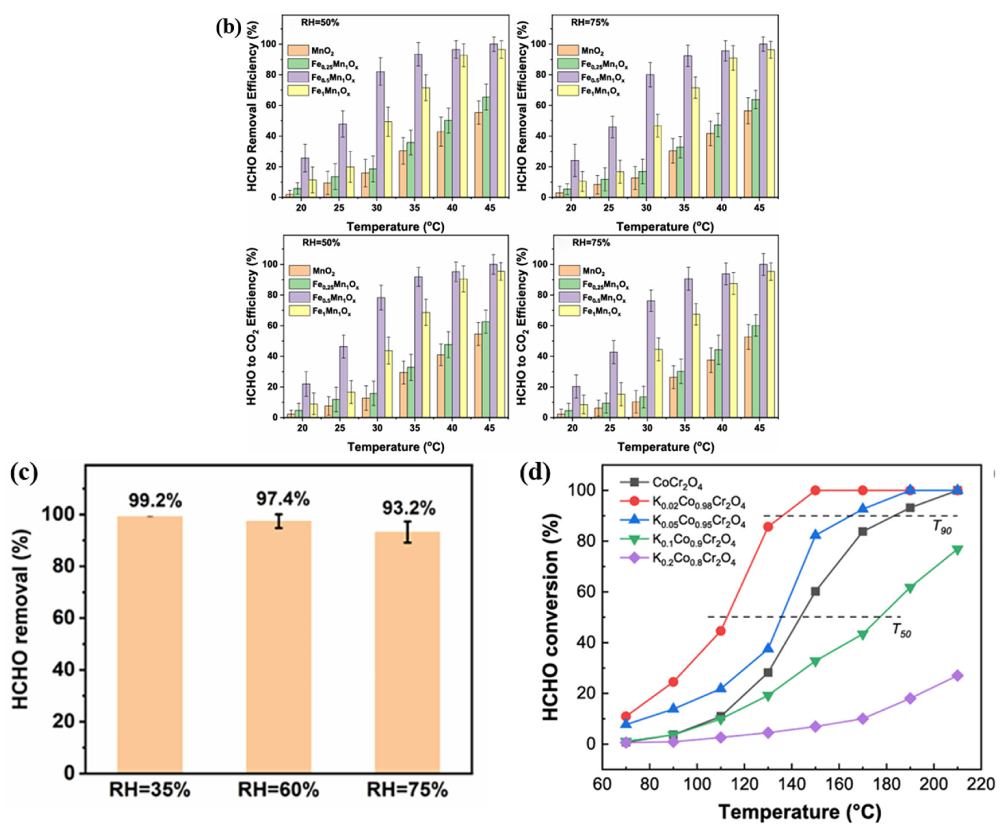 The catalytic oxidation performance of formaldehyde is influenced by the preparation method of the catalyst, microscopic morphology and structure, active sites, surface oxygen species, and experimental conditions such as reaction temperature, humidity, and gas flow rate. In particular, humidity has a significant impact on the catalytic oxidation of formaldehyde.