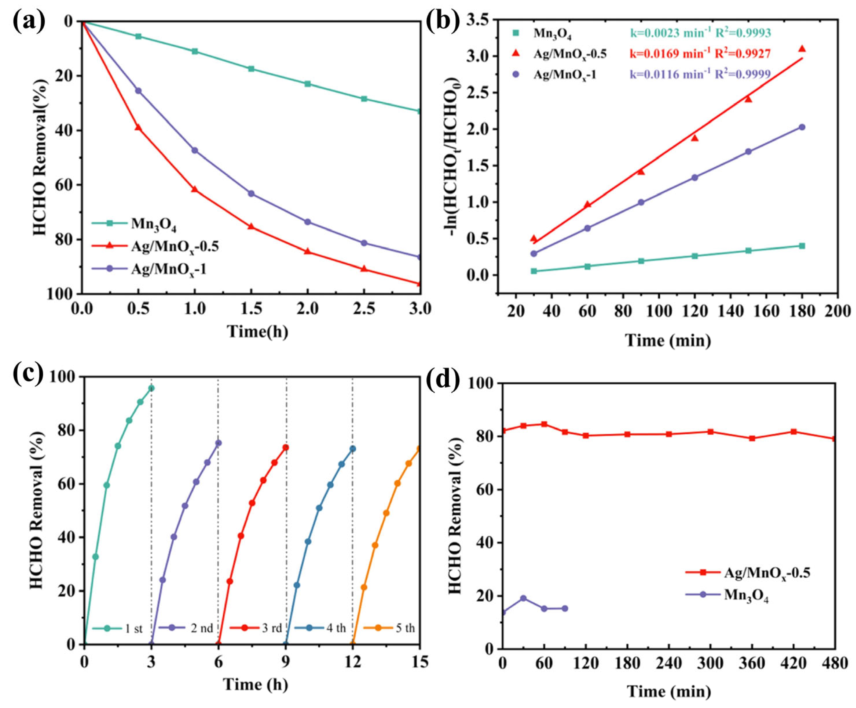 Tang et al. [83] prepared the Ag/MnOX catalyst by a one-step method at room temperature. By adjusting the molar ratio of Ag/Mn (0.1–1), they optimized the contents of Mn4+ and Ag0, thereby regulating the active sites. As shown in Figure 9, the Ag/MnOX-0.5 removal rate reaches 100% within 3 h.