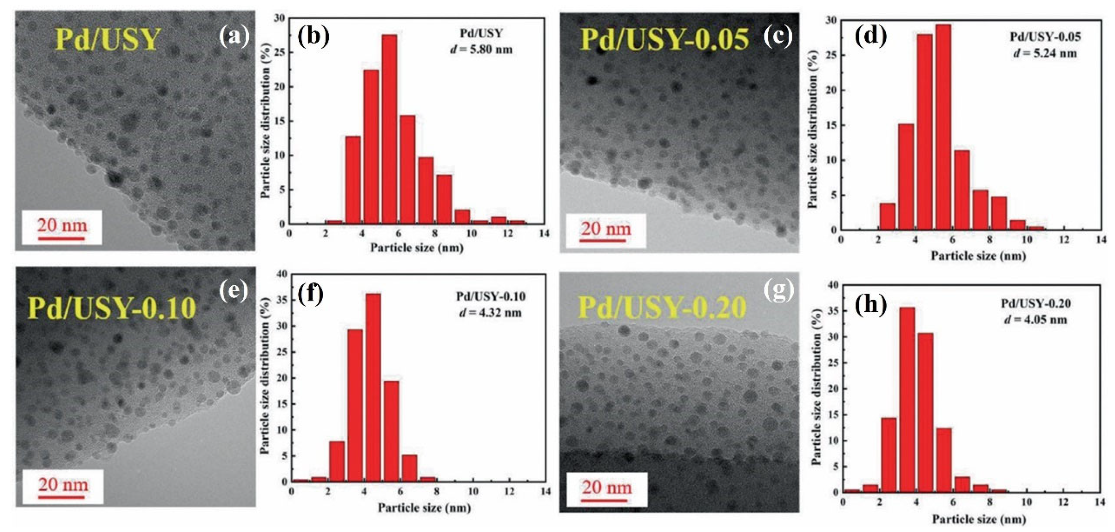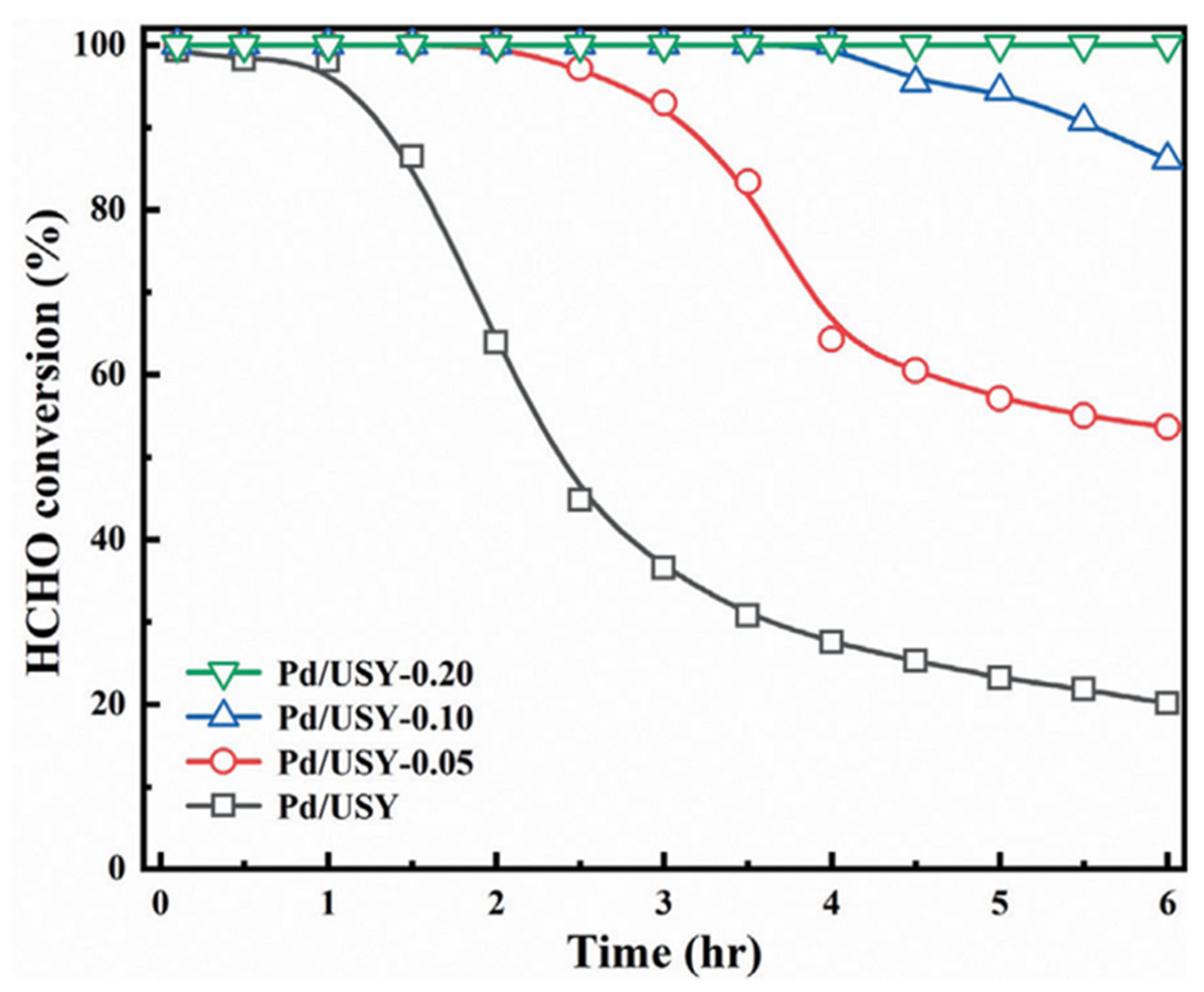 Compared with metal oxide carriers, non-metal oxide carriers have the advantages of high specific surface area, high thermal stability, and low cost of raw materials. They can provide an ideal platform for precious metals with low loading, high activity, and long lifespan. They have also been widely used in the oxidation of formaldehyde reactions. Liu et al. [74] prepared a Pd/USY catalyst with a large specific surface area using the acid treatment and impregnation methods. As can be seen from Figure 11, after being treated with 0.2 M HCl, the Pd/USY catalyst shows a smaller Pd particle size than the others. The Figure 12 shows that the catalyst treated with 0.2 M HCl can completely oxidize formaldehyde into carbon dioxide and water with 6 h under the conditions of 25 °C, 150 ppm HCHO, 20% O2, 35% RH, and WHSV = 150,000 mL/(g·h). This work is the first to apply the acid washing, aluminum removal, and hydroxylation strategy to USY molecular sieves, achieving efficient formaldehyde oxidation at room temperature. In the future, it can be extended to other molecular sieves (Beta, ZSM-5) or metal oxides (TiO2, CeO2) to verify its universality.