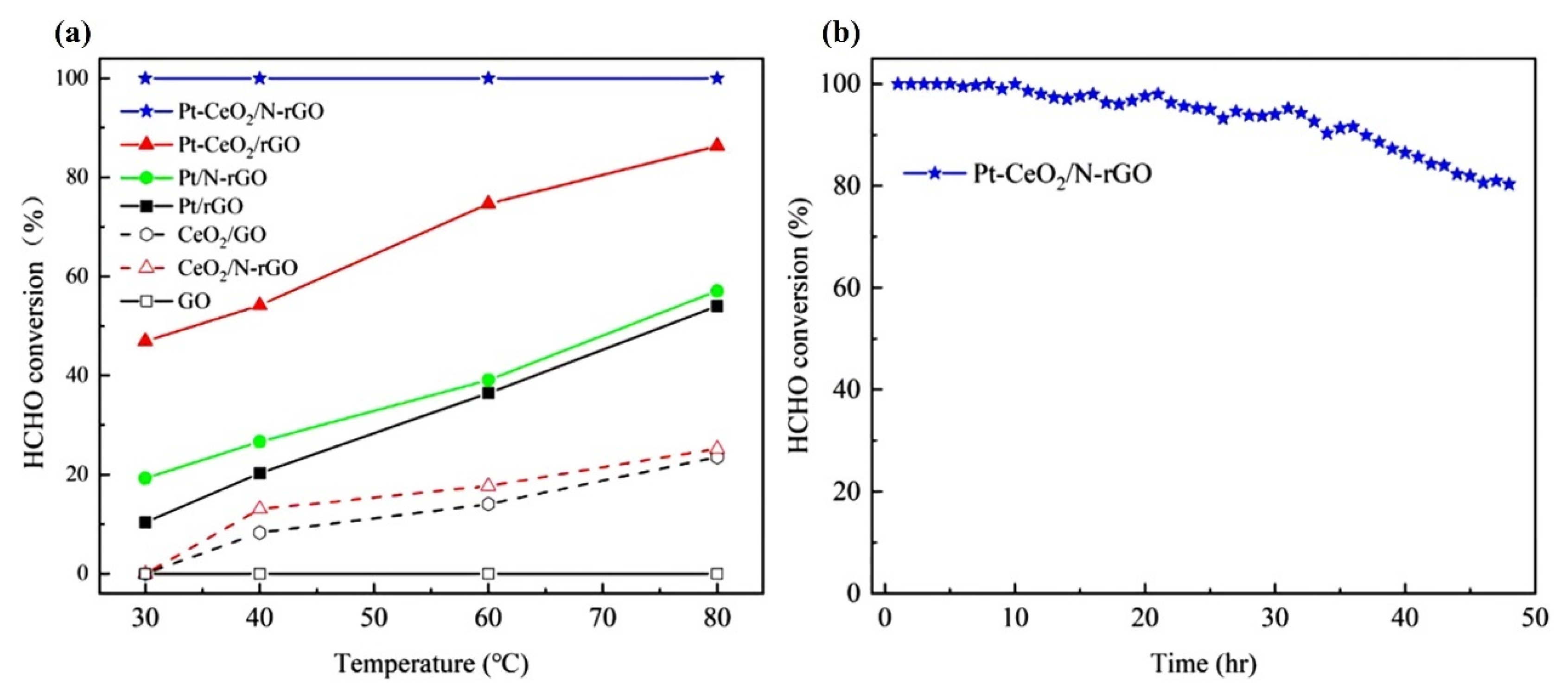 Guo et al. [71] employed a one-step solvent heat, impregnation, and calcination combined process to prepare a Pt-CeO2/N-rGO composite catalyst. As shown in Figure 13, the conversion rate of 100 ppm HCHO by Pt-CeO2/N-rGO reached 100% within 1 h at 30 °C and RH of 35. After continuous operation for 48 h, the activity still remained above 80%. This work achieves the synergistic goal of complete oxidation at room temperature and no secondary pollution through a three-pronged strategy of defect engineering, electronic coupling, and microstructure regulation, with low content (0.7%) of precious metals.